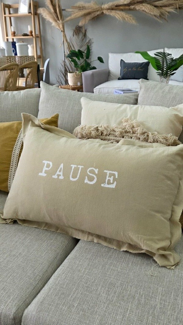 Aportá calma y estilo a tus ambientes con este Almohadón liso de 40 x 60 cm, destacado por su estampa frontal con la palabra "Pause". Un diseño moderno y minimalista, ideal para dormitorios, livings o rincones de descanso.